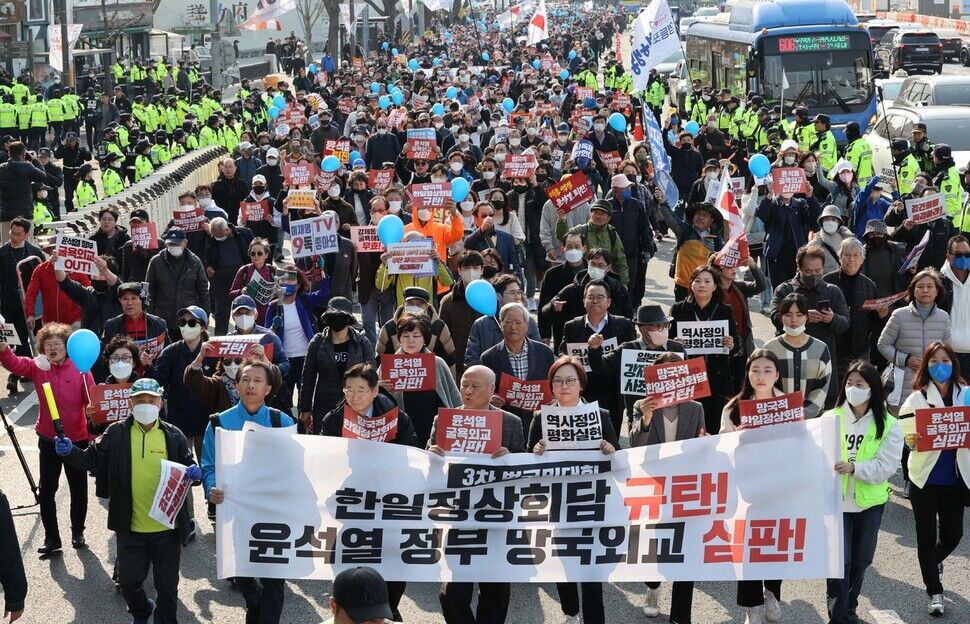 韓国メディアによると7000人規模が集まった。参加者は「歴史正義、平和実現」「尹錫悦退陣」などと書かれた紙を掲げ、市中心部を練り歩いた。