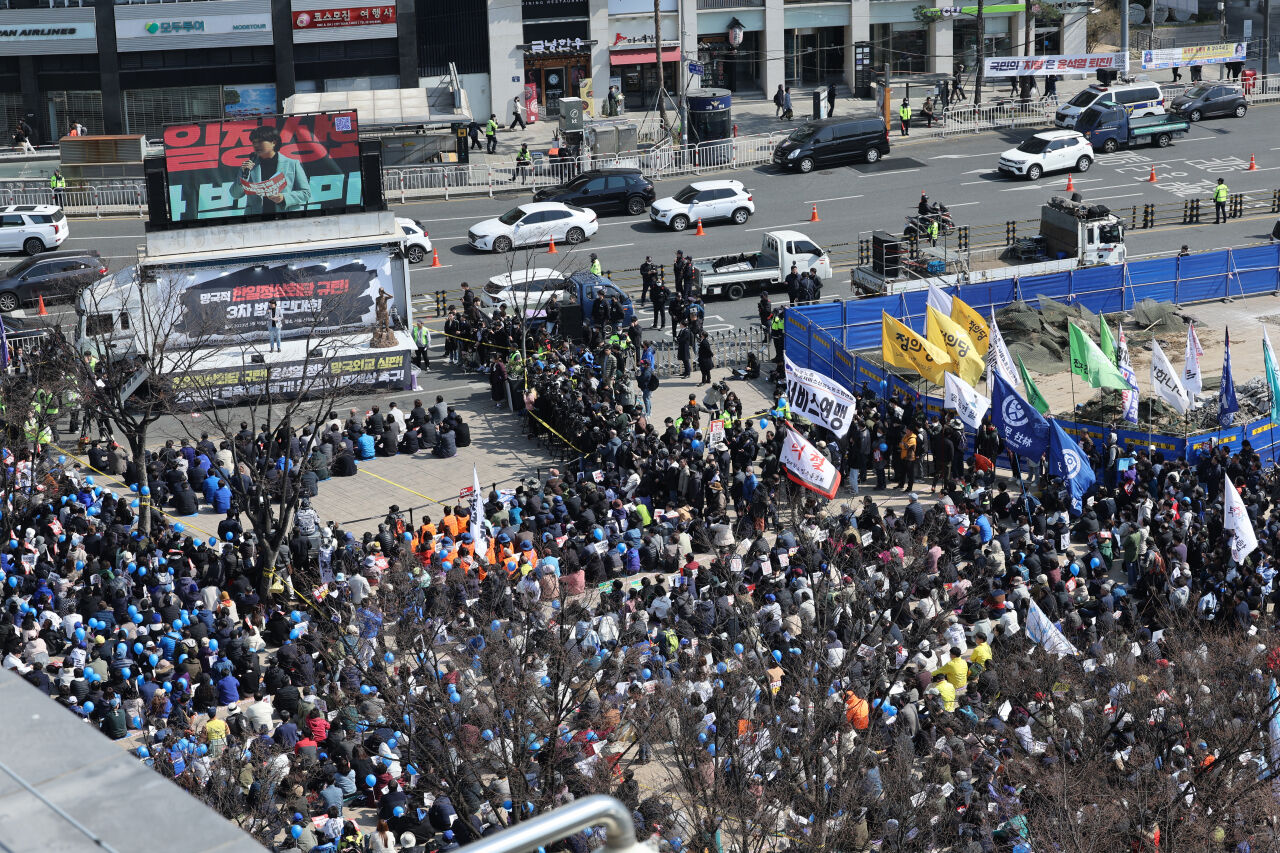 午後2時ごろに始まった集会には最大野党「共に民主党」の李在明(イ・ジェミョン)代表が登壇した。「日本の機嫌さえ取れれば何でもやるという屈辱的な態度」と尹大統領を糾弾した。李氏は17日、SNS(交流サイト)で集会への参加を呼びかけていた。