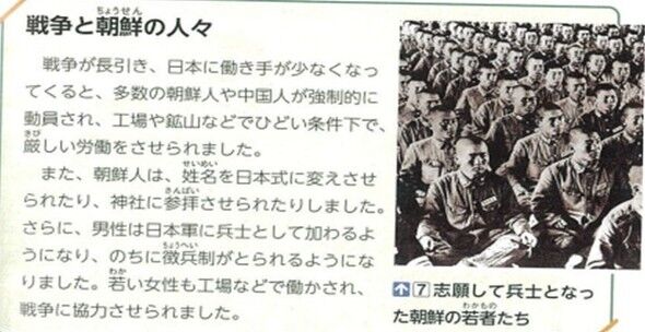 今回の検定で最も目立つ「改悪」は、第2次世界大戦末期に行われた朝鮮人の「徴兵」を努めて隠そうという日本政府の試みだ。東京書籍の6年生用社会科教科書を見ると、短く髪を切り、軍服を着て並んで座る若者たちの様子を写した白黒写真の下に「志願して兵士となった朝鮮の若者たち」という説明が付いている。2019年検定通過本に載っていた「兵士となった朝鮮の若者たち」という説明をわざわざ変更し、「志願して」という表現を付け加えたのだ。
