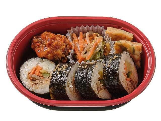 おかずにはチヂミや野菜炒め、ヤンニョムチキンが入っていて、チヂミはしっとりとした食感とにらの風味、野菜炒めはシャキシャキとした食感とほどよい塩味、ヤンニョムチキンは甘辛い味付けとジューシーな味わいで、キンパとの相性抜群です。