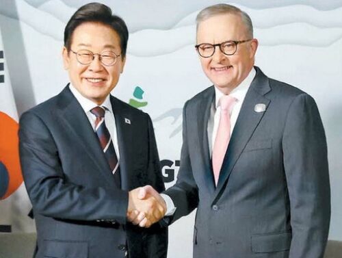 ↑オーストラリアのアンソニー・アルバニージー首相と握手する李在明(イ・ジェミョン)さん。