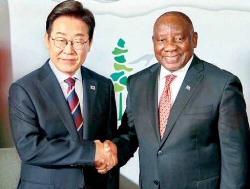 ↑南アフリカ共和国のマタメラ・シリル・ラマポーザ大統領と握手する李在明(イ・ジェミョン)さん。