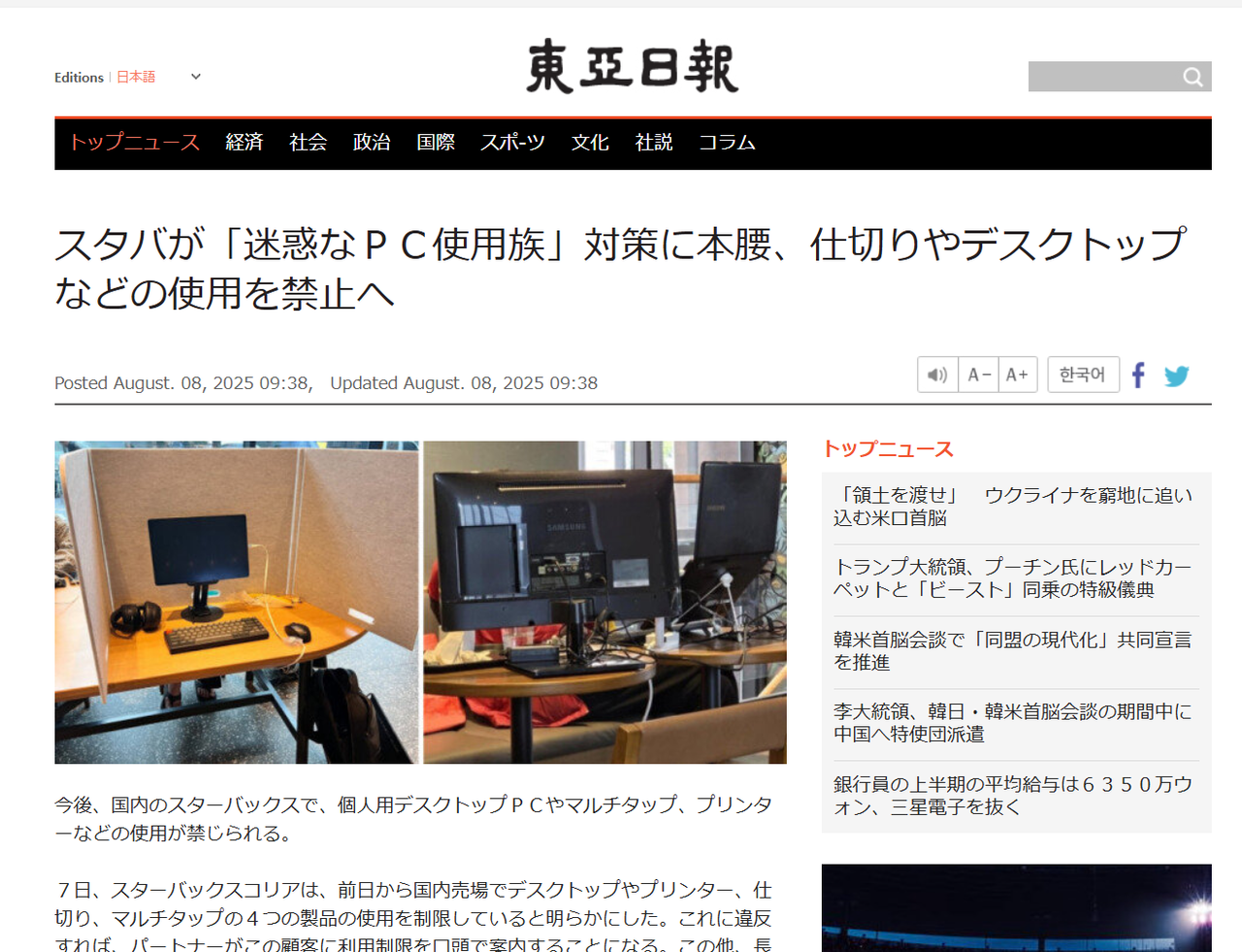 以前であればカフェにデスクトップPCを持ち込んで作業する風景は、笑える“ネタ画像”として話題に挙がる程度だったが、韓国では一線を越えてしまったようで店内ルールとして禁止された。